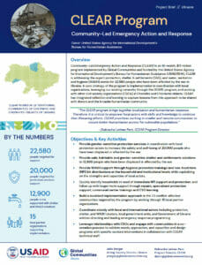 CLEAR is an 18-month, $15 million program implemented by Global Communities and funded by the United States Agency for International Development’s Bureau for Humanitarian Assistance (USAID/BHA). CLEAR is addressing the urgent protection, shelter & settlements (S&S), and water, sanitation and hygiene (WASH) needs for 22,580 people who have been affected by the war in Ukraine. A core strategy of the program is implementation in coordination with local organizations, leveraging our existing networks through the DOBRE program, and working with other civil society organizations (CSOs) in Chernihiv and Chernivtsi oblasts. CLEAR has integrated reflection and learning to capture lessons from this approach to be shared with donors and the broader humanitarian community.