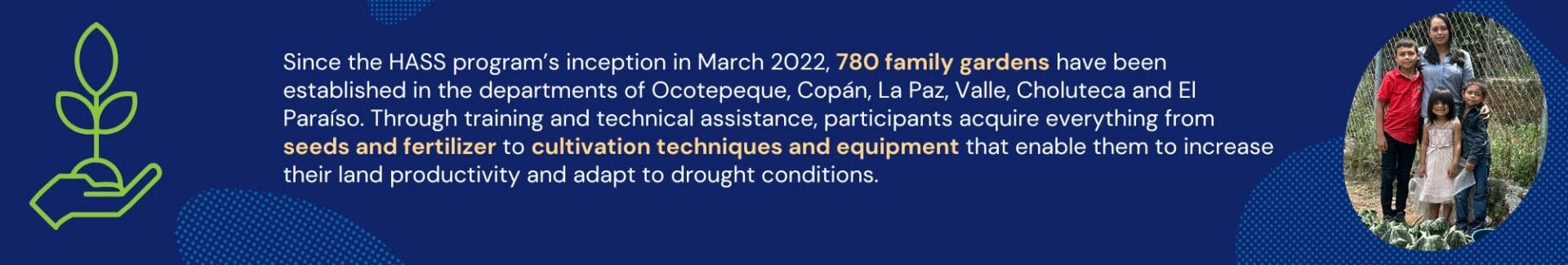 Before participating in the HASS program, Glendy had to travel almost 14 miles to the nearest town to buy produce. Now, thanks to resources and training she received through HASS, a variety of fresh vegetables are literally at her fingertips. Every morning, she and her family get up early to water and take care of the land. With the daily harvest, Glendy is able to feed her children in a healthier and more sustainable way, significantly improving their quality of life and future.