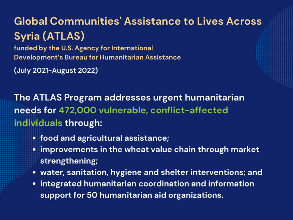 Global Communities has been providing humanitarian assistance in Syria since 2014 but most recently received funding from the U.S. Agency For International Development’s Bureau for Humanitarian Assistance (USAID/BHA) to implement the Assistance to Lives Across Syria (ATLAS) program. As part of ATLAS, Global Communities is responding to flooding, wind and fire incidents and emergency winterization needs at Atmeh camp.