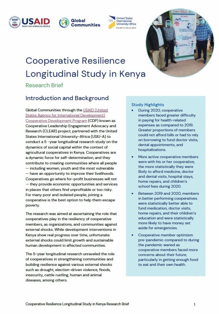 Global Communities through the USAID (United States Agency for International Development) Cooperative Development Program (CDP) known as Cooperative Leadership Engagement Advocacy and Research (CLEAR) project, partnered with the United States International University-Africa (USIU-A) to conduct a five-year longitudinal research study on the dynamics of social capital within the context of agricultural cooperatives in Kenya.