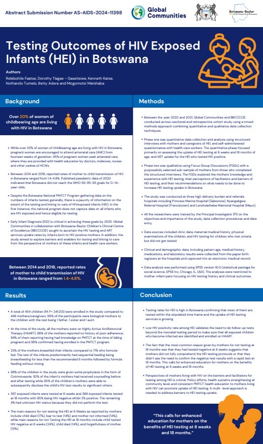 This poster, presented in 2024 at the 25th International AIDS Conference by Global Communities, showcases the results of a study on early infant diagnosis in Botswana.