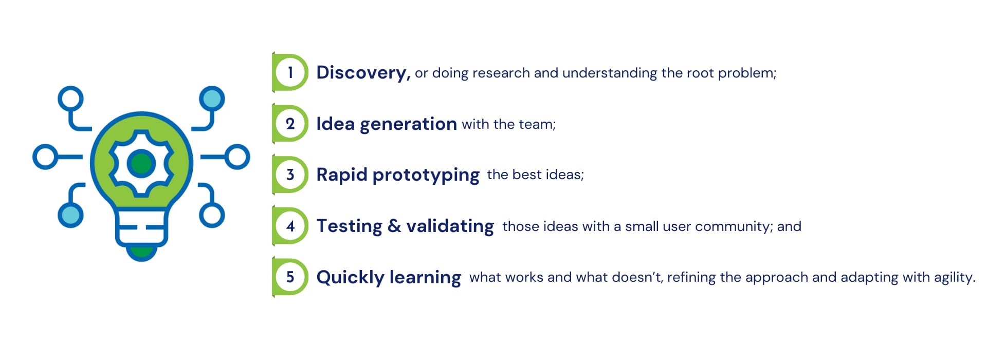 In practice, this involves creating a strong sense of teamwork and co-creating solutions with our technical and program teams. Our main structure for success revolves around these five steps: