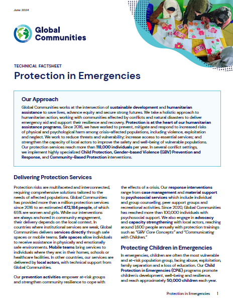 Global Communities works at the intersection of sustainable development and humanitarian assistance to save lives, advance equity and secure strong futures. We take a holistic approach to humanitarian action, working with communities affected by conflicts and natural disasters to deliver emergency aid and support their resilience and recovery. Protection is at the heart of our humanitarian assistance programs. Since 2016, we have worked to prevent, mitigate and respond to increased risks of physical and psychological harm among crisis-affected populations, including violence, exploitation and neglect. We work to reduce threats and vulnerability; increase access to essential services; and strengthen the capacity of local actors to improve the safety and well-being of vulnerable populations. Our protection services reach more than 118,000 individuals per year. In several conflict settings, we implement highly specialized Child Protection, Gender-based Violence (GBV) Prevention and Response, and Community-Based Protection interventions.